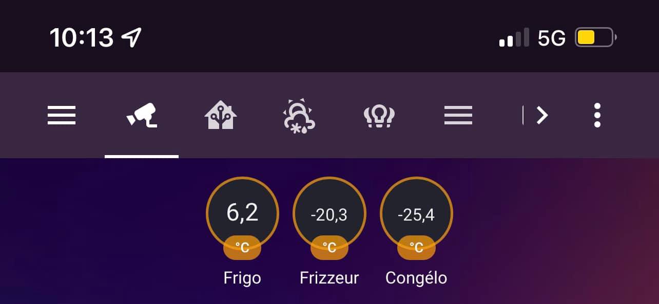 Je n’ai pas de capteurs dans mon frigo, mais j’ai adapté et testé ce code à partir d’un capteur de température météo quelconque et ça marche. Tu n’as plus qu’à changer les noms de tes capteurs et les seuils de température que tu veux (ici > 4 dans mon exemple, chez toi ce sera plutôt < 10, d’après ton post) :