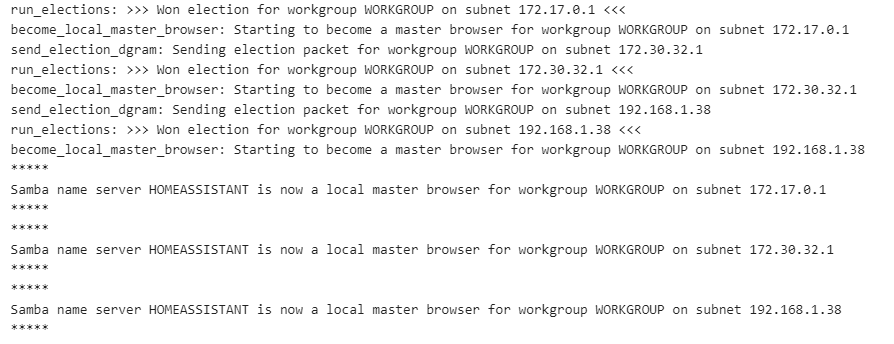 Samba name server HOMEASSISTANT is now a local master browser for workgroup WORKGROUP on subnet 172.17.0.1
