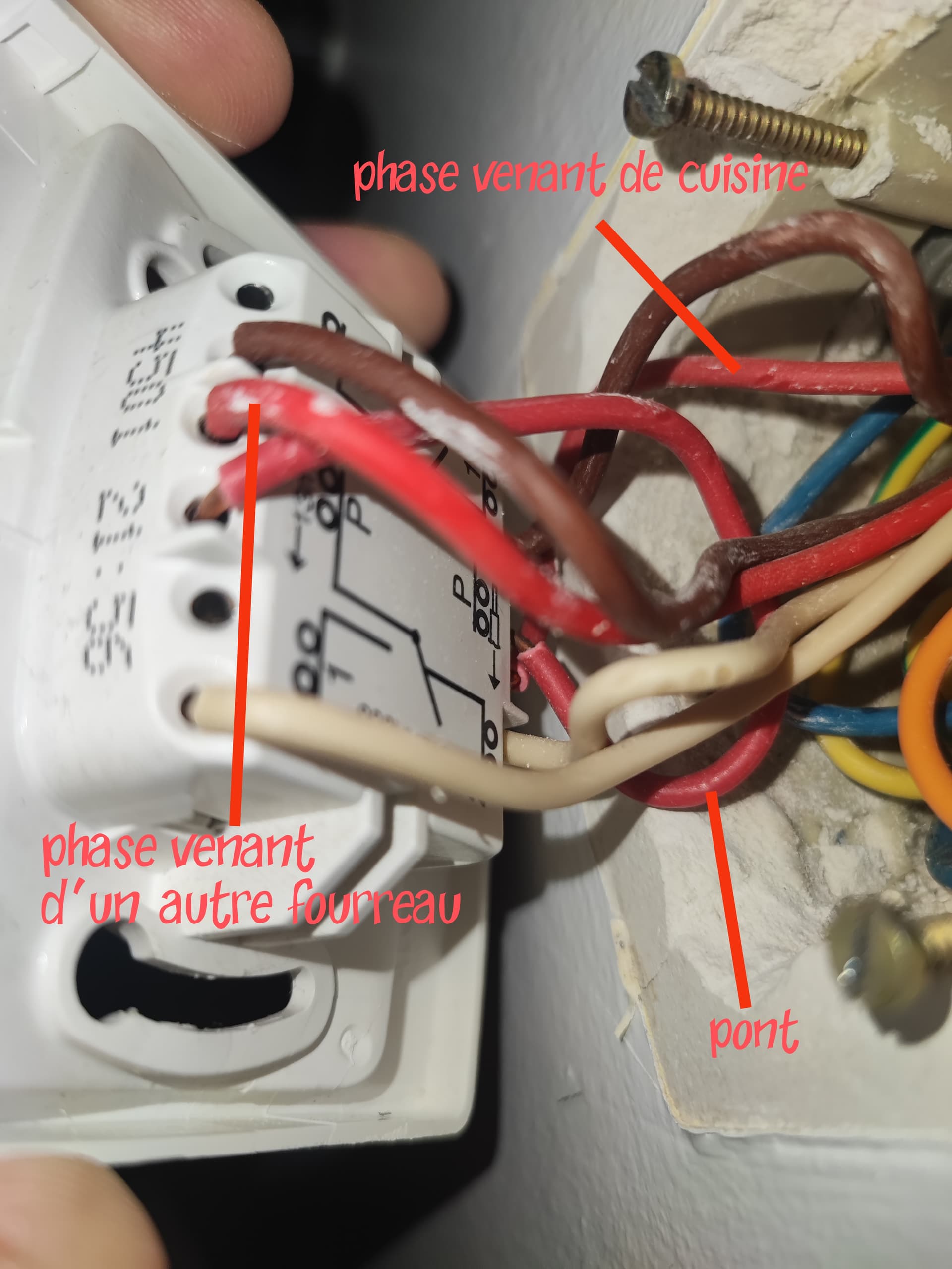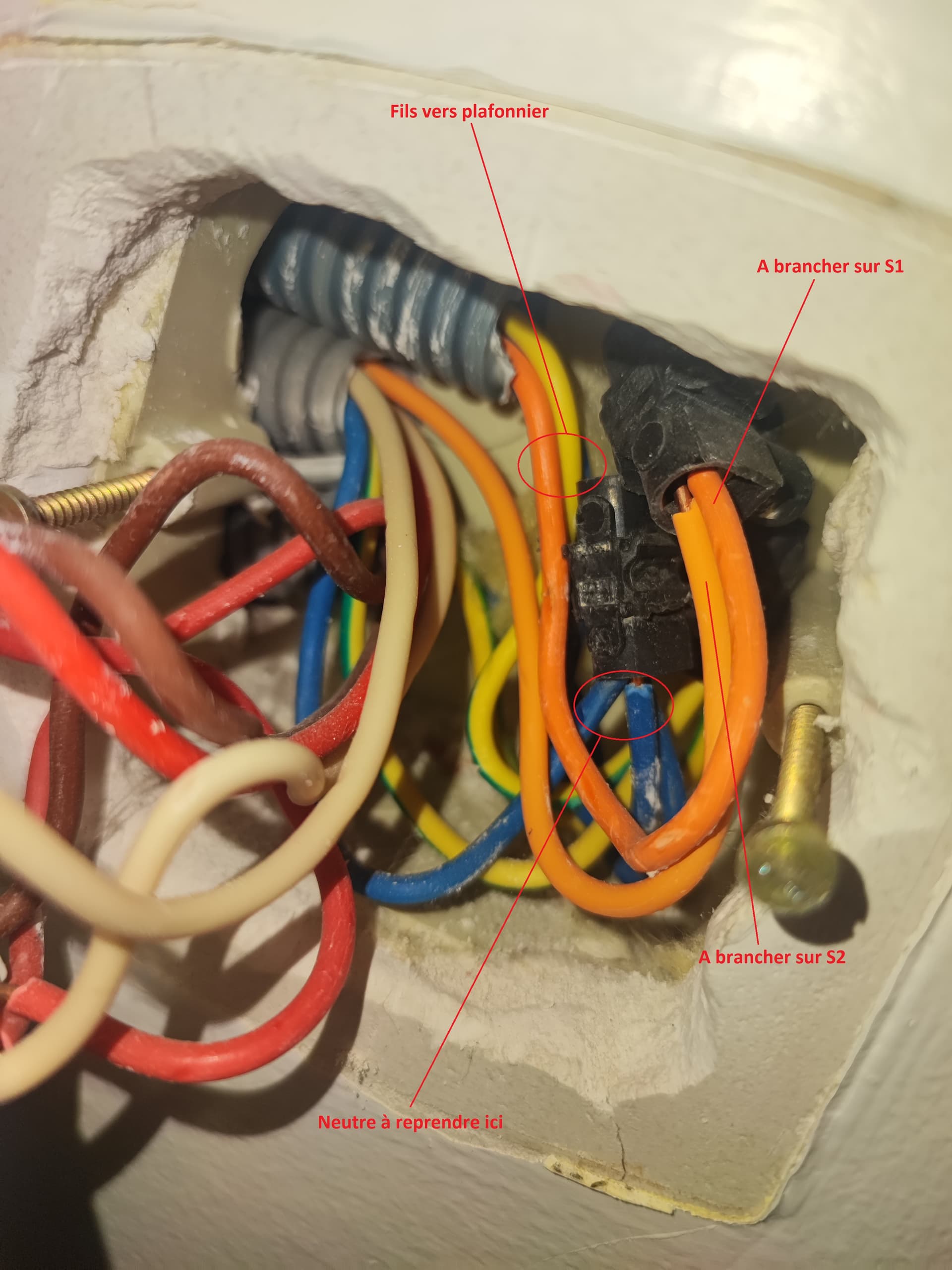 1- raccorder le fil rouge (phase qui va de la boite d’encastrement cuisine vers salle) en S2