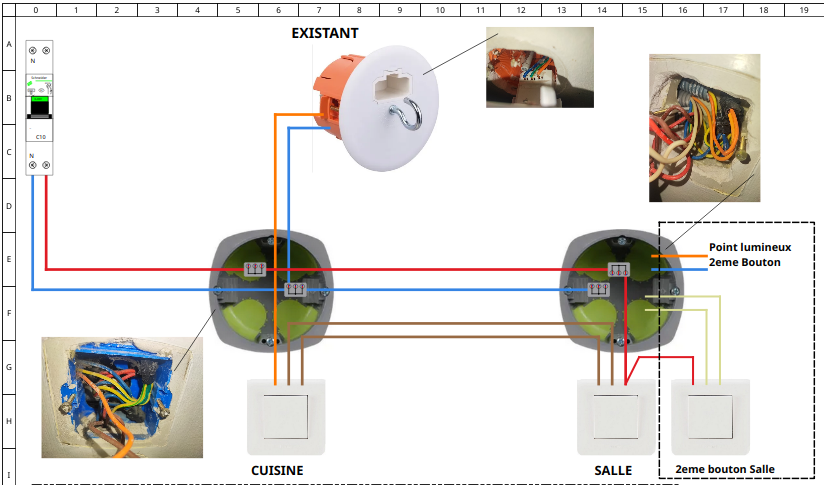 J’ai ajouté Le deuxieme bouton Salle etant pour un autre point lumineux, mais alimenter par la meme phase et neutre que le bouton salle (afin de mieux comprendre la totalité du circuit).