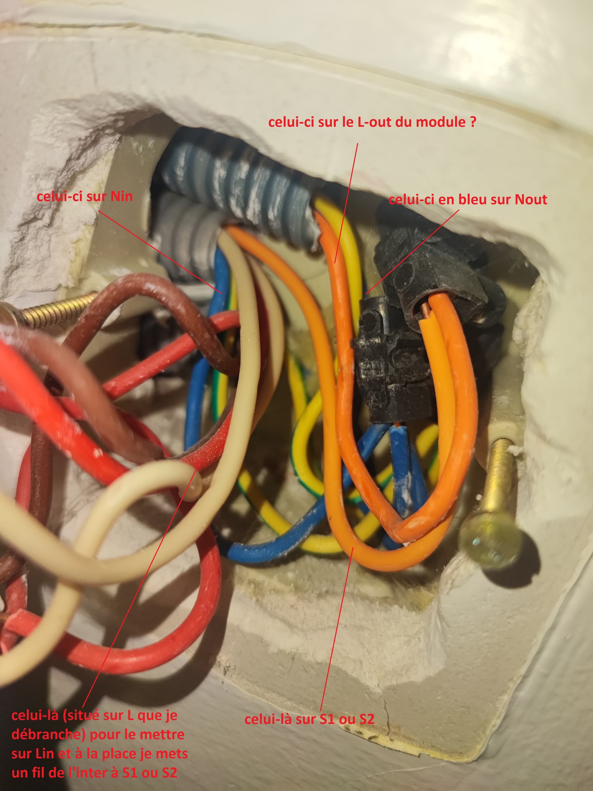 Tu prends la phase sur le rouge du V/V salle qui va alimenté le module!, et tu branches un fil à sa place qui ira sur S1 ou S2