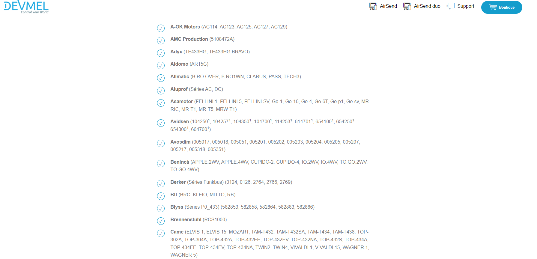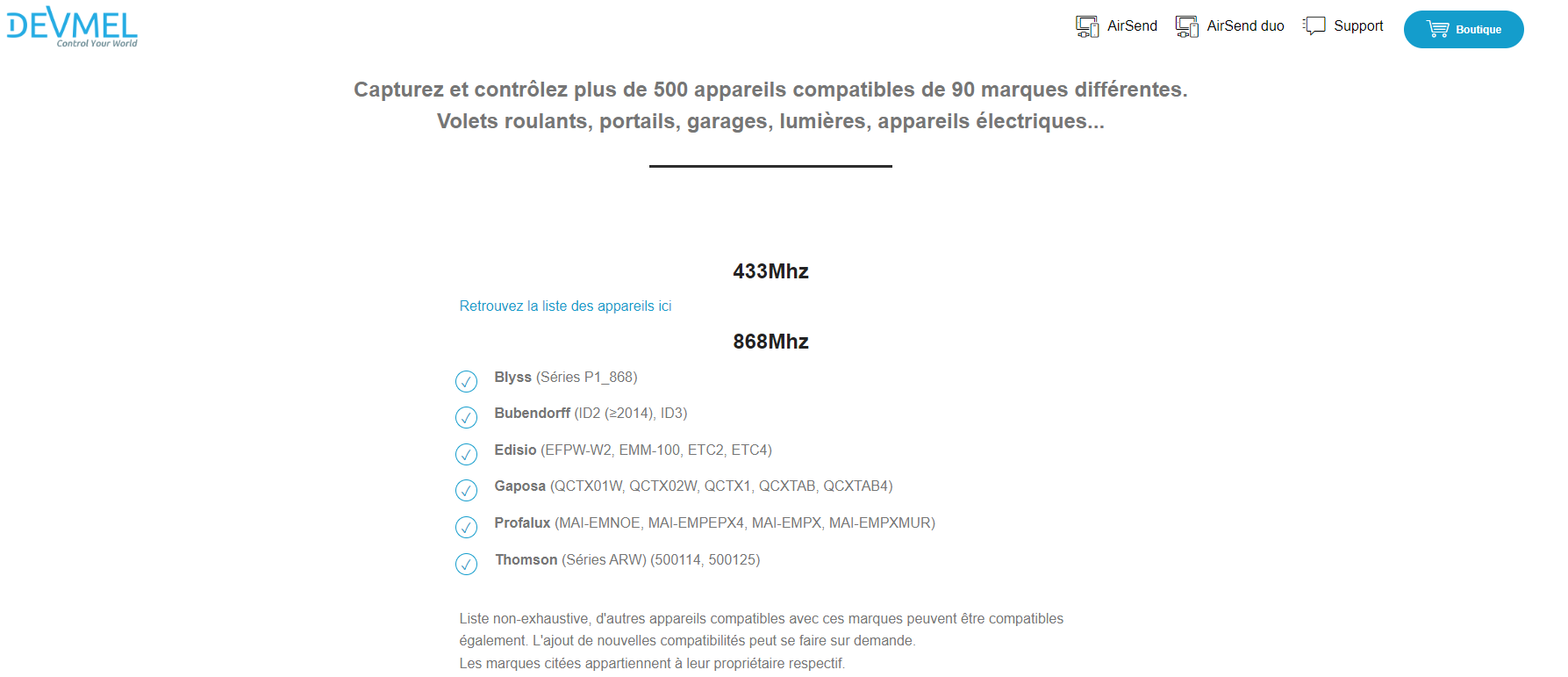 Le AirSend Duo n’est pas plus compatible en 868 MHz qu’en 433 MHz pour les volets Bubendorff d’avant 2014. Il n’y a pas de liste des appareils différente en fonction de la fréquence radio.