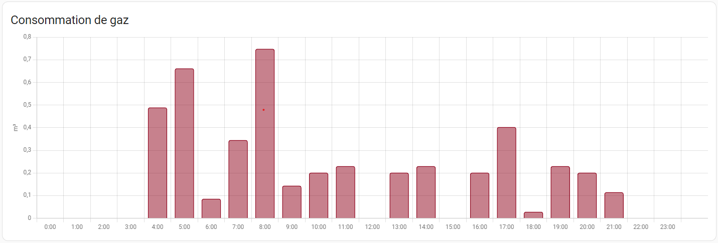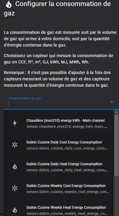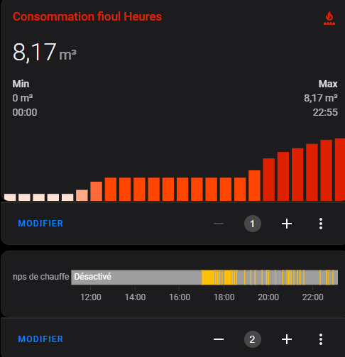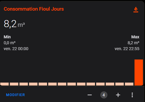 Vous aurez remarqué que j’ai mis device_class gas et unité de mesure m3, c’est pour pouvoir suivre la conso via le dashboard energie que j’apprecie beaucoup. Si jamais quelqu’un sait comment ajouter un suivi de consommation de fioul je suis preneur.