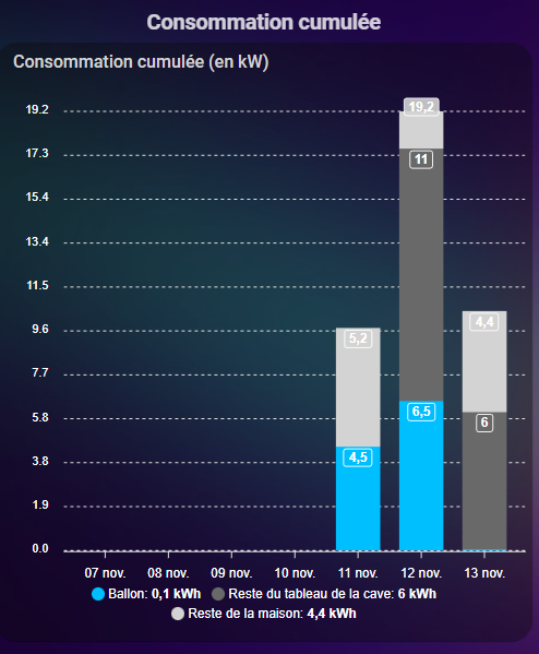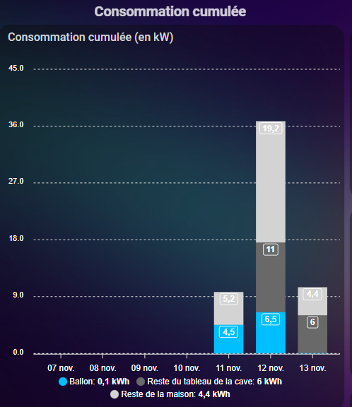 Je cherche à afficher sous forme de colonnes empilées, des capteurs (pas de problèmes pour cela), et des soustractions de capteurs (c’est là que ça pose problème). Dans mon exemple, j’ai des capteurs de consommation pour un circuit électrique, puis un pour le tableau entier, je cherche à afficher la différence entre les 2.