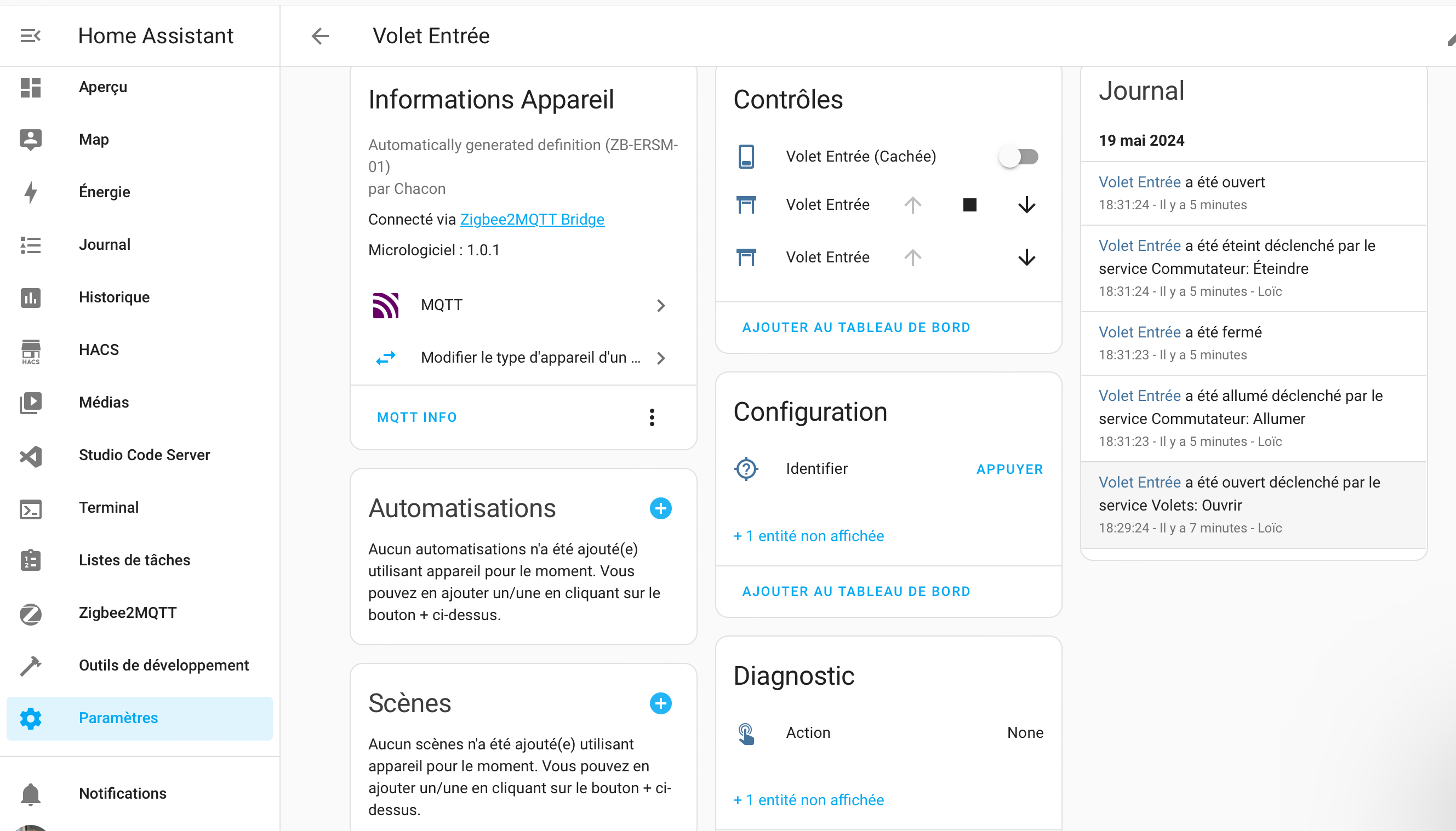 Bonjour, je suis débutant et autodidact sur la domotique, j’ai installé HA sur un raspberry pi avec dongle zeegbi et clé zwave. J’avais des modules chacon dio installés sur mes volets en commande via mon portable. Je souhaite les appairers sur HA, mais le constructeur n’est pas reconnu sur zeegbi2mqtt, du coup je suis dans une impasse. Je ne sais pas comment calibrer mes volets, je ne sais pas quand ils sont ouverts ou fermés (sauf quand je suis sur place évidemment). J’ai beau parcourir le forum, je ne trouve pas de réponse à mon problème… la question va certainement vous sembler basique mais si vous pouvez me donner des pistes pour me dépétrer de ce casse-tête n’hésitez surtout pas. D’avance merci