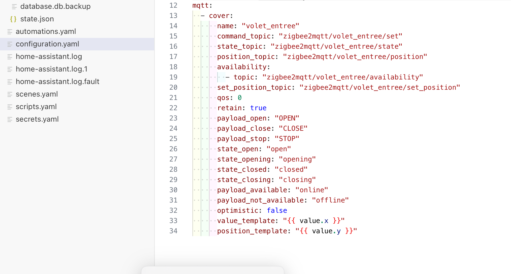 Il faudra que tu remplaces ‹ home-assistant/cover › par ‹ zigbee2mqtt/volet_entree › ou quelque chose comme ça.