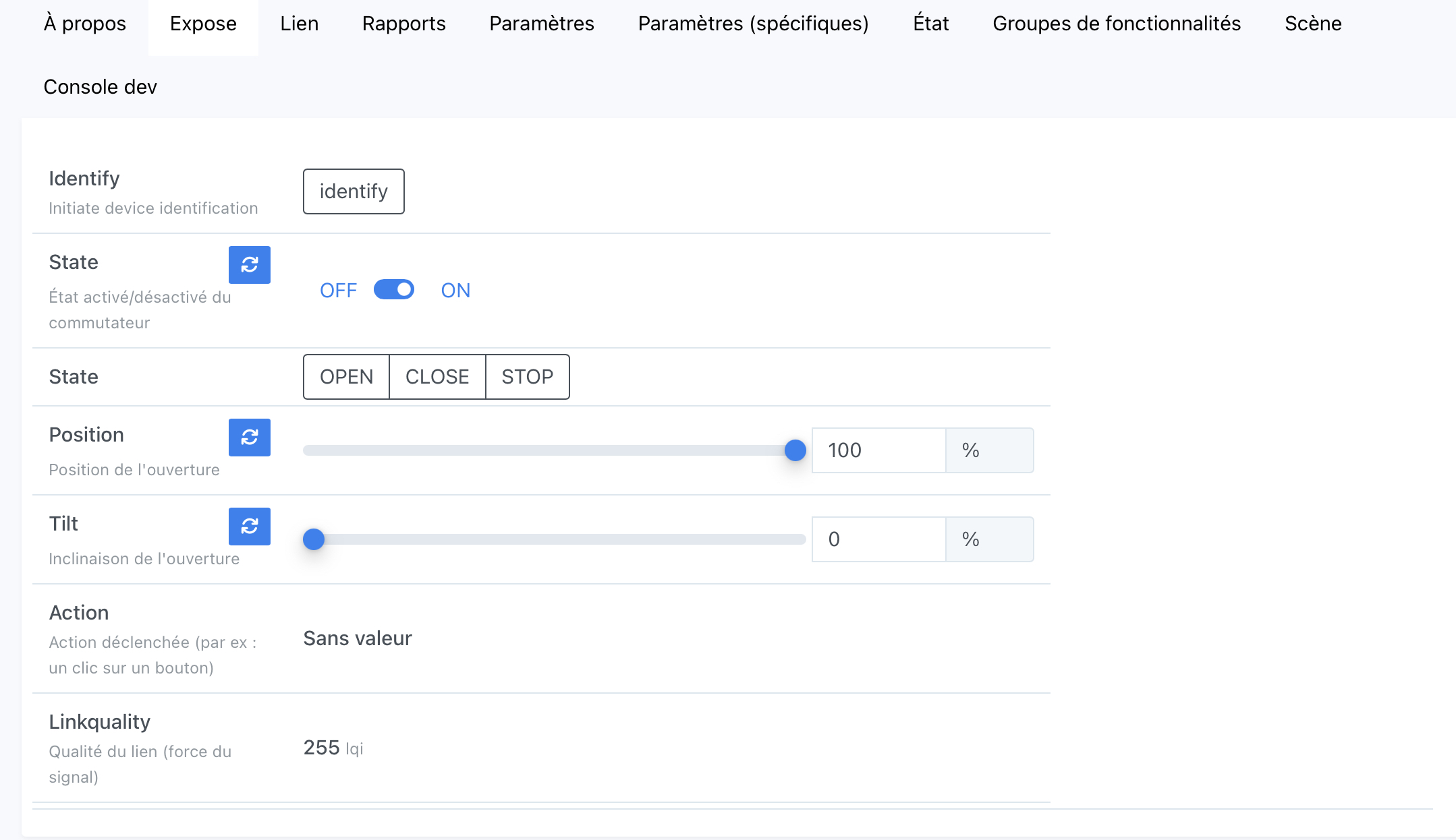 Bon il y a du progrès j’ai enfin compris ce qu’il fallait faire pour intégrer le fournisseur. Je peux maintenant à coup sûr ouvrir ou fermer me volet, mais je ne peux pas faire de fermeture partielle. Il y a d’autres choses que je dois changer certainement, mais je ne vois pas encore quoi… peut-être avez-vous une piste pour moi? Ci-joint les capture d’écran de ce premier petit succès.