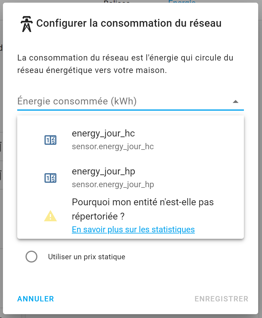 J’ai trouvé une solution pour que les données de l’intégration MyEnedis soient visibles dans l’Energy Dashboard cependant je pense pas que ce ne soit vraiment utile car les données sont mises à jour trop peut souvent.