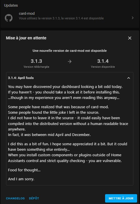 « J’ai fait ça pour m’amuser un peu. J’espère que certains l’apprécieront un peu. Mais ça pourrait avoir une toute autre incidence. Lorsque vous installez un composant personnalisé en dehors de Home Assistant, des contrôles et des vérifications de qualité strictes, vous êtes vulnérable. Cela alimente la réflexion. Et je suis désolé. »