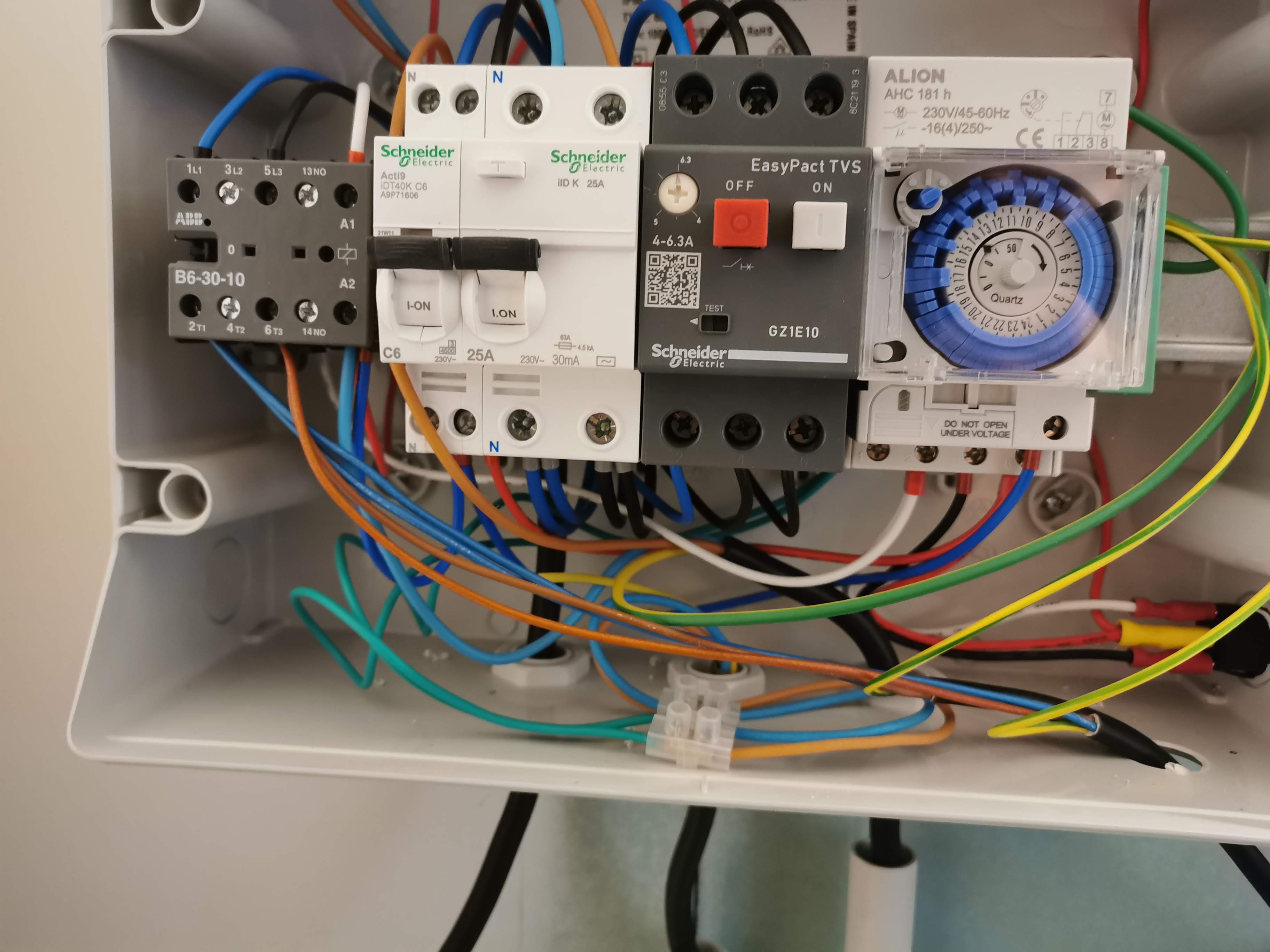 Pour le reste du tableau il y a un 30 mA qui doit protéger le tableau complet. La pompe a un EasyPact TVS comme sur la photo au-dessus. D’ailleurs le gel elec est connecté dessus le 1 et 5 …