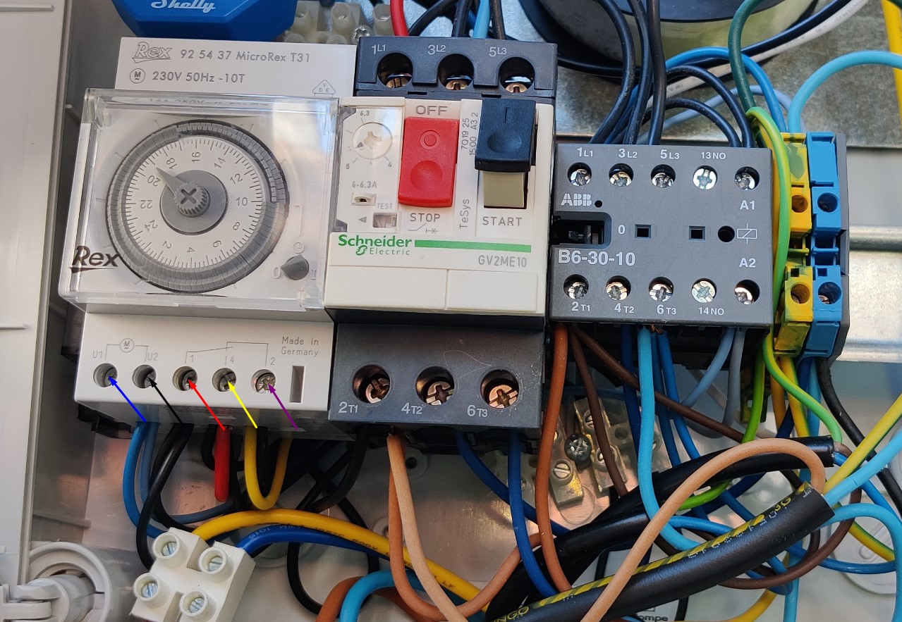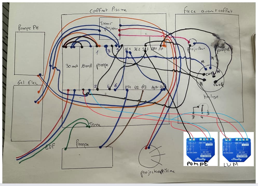 Je me suis dit en regardant les autres schémas que c’est le contact CH1 3 qui semble important il fallait se brancher dessus. En tous cas j’ai suivi les câbles et le schéma représente bien la réalité. Je souhaite faire un peu comme tous les autres c’est a dire garder l’horloge au cas ou le shelly dysfonctionne. Elle sera sur la position 0. Sur A1 c’est le bouton de la pompe qui est connecté et qui arrive sur l’horloge en position M et CH1 4.
