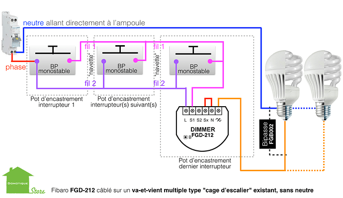 Par contre tout arrive dans la même boîte de dérivation donc je peux distribuer ce que je veux (phase, neutre, retour) où je veux.