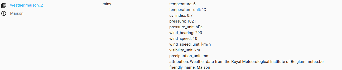 J’aimerais récupérer les températures minimale et maximale de mon entité météo ci-dessous afin de réaliser une automatisation. J’ai beau chercher dans les outils de développement, mais je ne les trouve pas, alors qu’elles apparaissent bien dans ma carte météo.