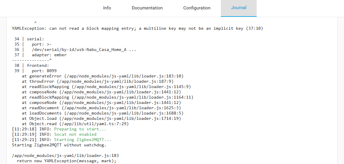journal d’erreur lors du lancement de Zigbee2mqtt:
