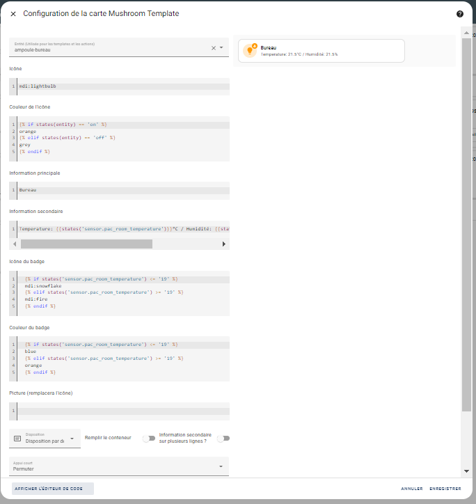 Personnellement, dans un cas où il ne s’agit que de visualisation et où il n’y a pas besoin d’agir sur des boutons supplémentaires, je me contente très souvent de rajouter des infos dans une carte mushroom template. D’autant plus qu’avec mushroom tu peux définir des comportements différents sur clic simple, double clic et appui maintenu, et par exemple ici avoir le toggle de la lampe sur clic simple, le « more info » de la lampe sur l’appuis maintenu et la navigation vers une page « températures » avec le double clic.