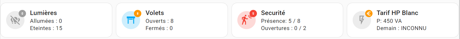 Note aussi qu’avec la carte mushroom template tu dispose d’un badge (mini icone) dont tu peux choisir l’icone et la couleur par exemple avec un template jinja et ainsi ajouter une info de plus (détecteur de mouvement, mode du chauffage, alerte, compteur etc…)