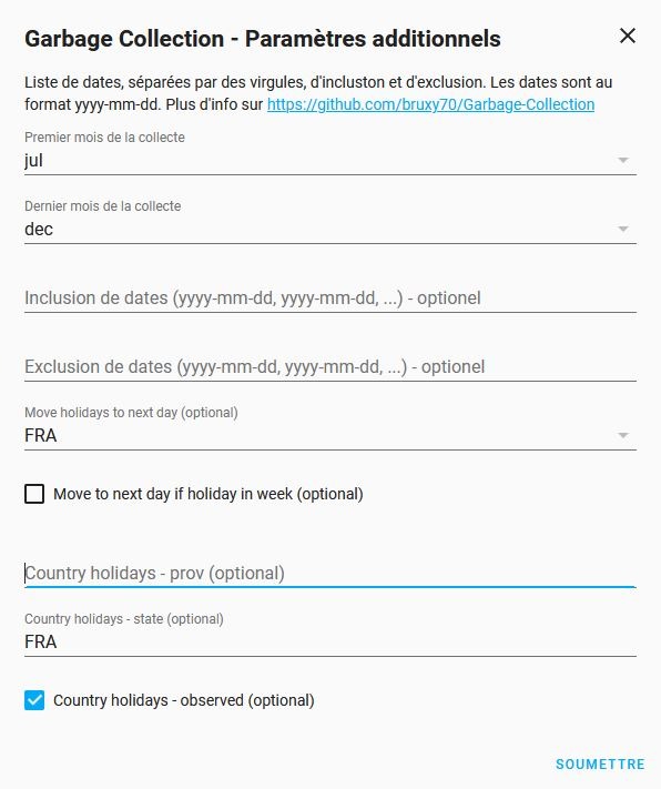 - Move to next day if holiday in week : Déplace la collecte des ordures au jour suivant si un jour férié est en semaine.