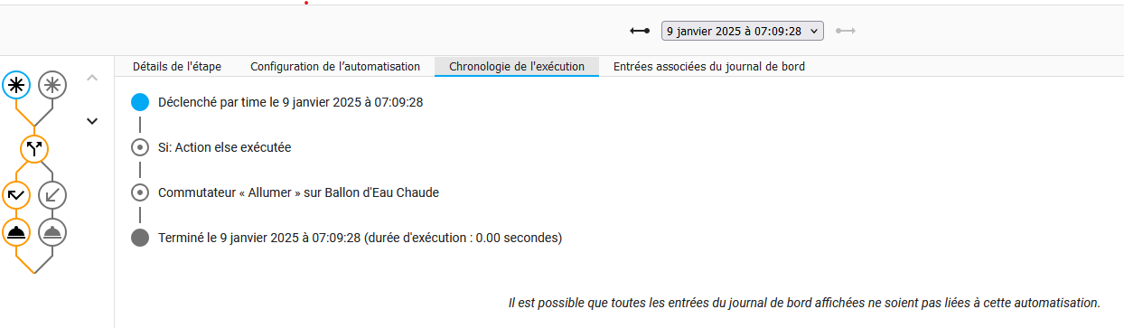Deuxième problème, dans cette même automatisation j’ai une condition qui execute, si l’heure se trouve entre 6:55 et 7:05, donc du coup, vous devinez que ça ne s’est pas lancé.