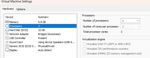 A savoir que je tourne sous VMware 17, en machine virtuelle. Je lui ai alloué 10Go de RAM, et les 3/4 du processeur.