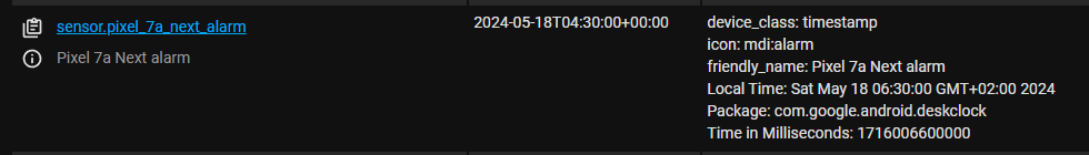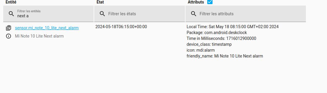 Sur mon android, avec l’application HA Companion, je récupère l’heure la prochaine Alarme. Seulement si je mets le téléphone sur 8h30, HA récupère 8h15… Avez vous une idé de pourquoi j’ai ce décalage ?