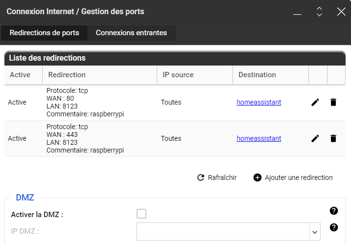 J’utilise HAOS, je suis chez Free avec une IP fixe, j’accède bien à mon Home Assistant en interne via http://192.168.1.32:8123/ et en http depuis l’extérieur via mon nom de domaine (OVH), aussi bien avec un navigateur et l’appli HA sur IOS et Android. Mais je souhaite du https. En zone DNS j’ai le type A vers mon IP fixe configuré chez OVH.