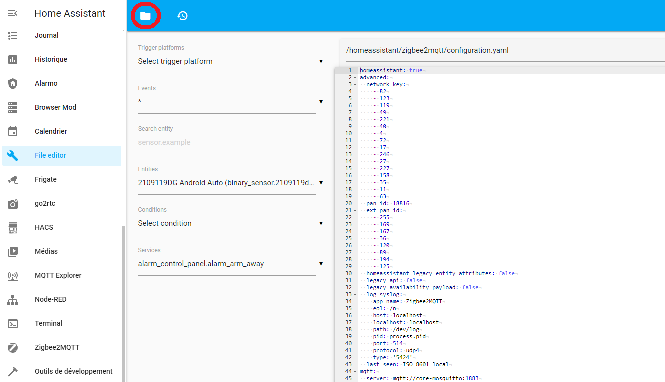 Ensuite, dans l’interface, tu cliques sur le symbole « répertoire » en haut à gauche pour accéder à l’arborescence de « homeassistant »