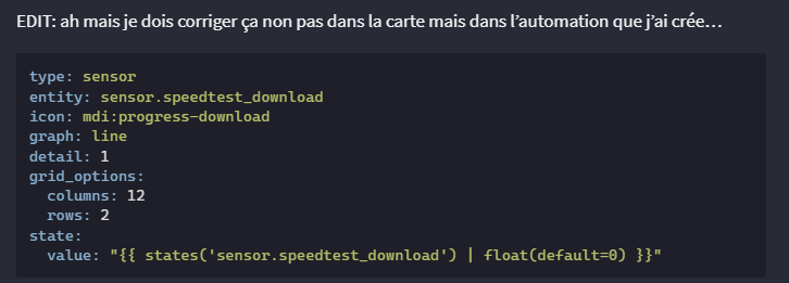 Je vais abandonner la mesure du speedtest et règlerais ce problème plus tard, histoire de pas rester bloqué là dessus. Et oui, j’ai pas forcément changé le nom du capteur dans la carte parce-que j’en ai test plusieurs pour m’assurer que ça ne viendrai pas de l’un ou l’autre de mes capteurs.