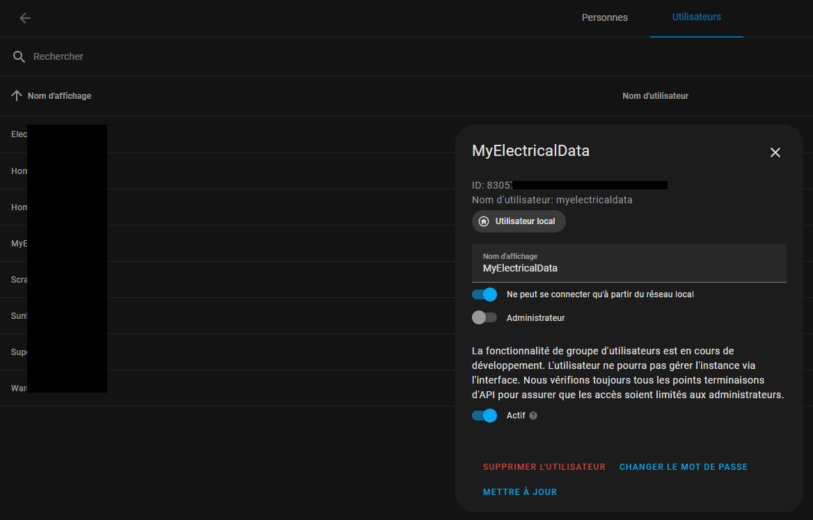 créer un utilisateur, pour Myelectricaldata dans paramètres / personnes et créer un utilisateur.