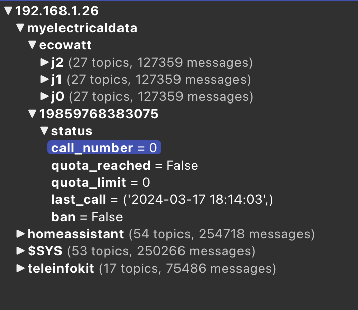 Warcrozes, j’ai du faire une connerie en bricolant, j’ai a nouveau plus accès au données my electricadata, j’ai refais me config.yaml, … j’ai l’impression que mqtt ne remonte pas grand chose. le log est incomprehensible pour moi. Voilà ce que voit mqtt, autant dire pas grand chose, je tourne en rond