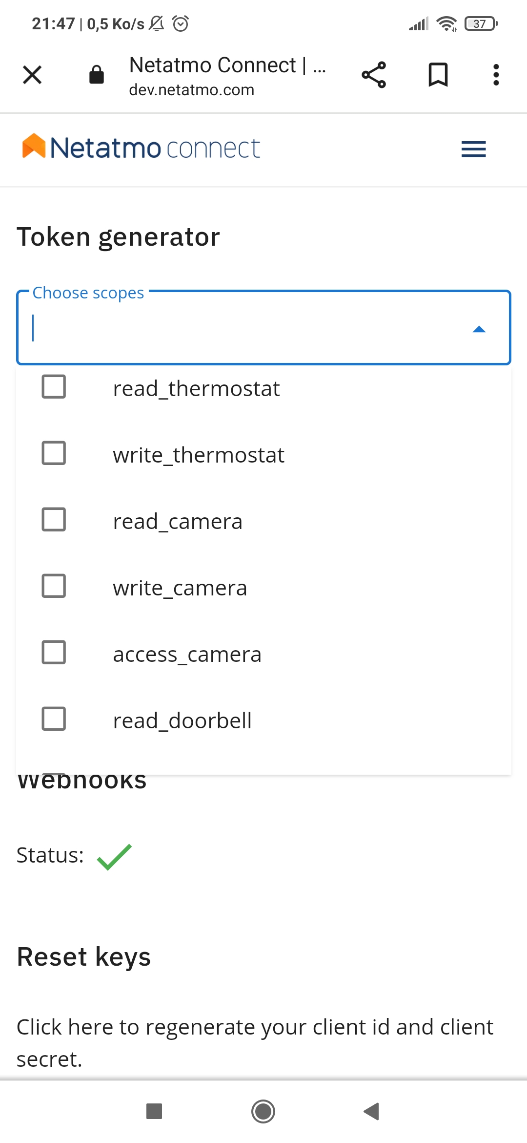J’ai était sur netatmo dev/ créé un appli pour avoir des codes et tout, ça me demande des trucs à cocher dans une liste pour generer un token. J’ai tout lit dans le doute .