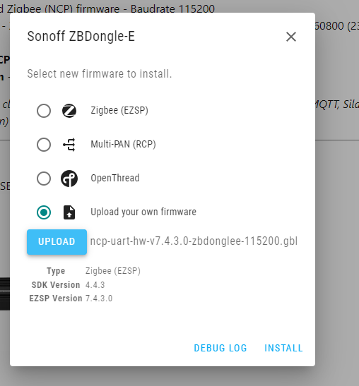 - J’ai utilisé le firmware_builds/zbdonglee/ncp-uart-hw-v7.4.3.0-zbdonglee-115200.gbl