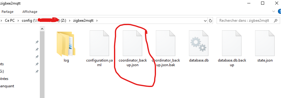 - Aller dans le dossier zigbee2mqtt et renommer coordinator_backup.json en coordinator_backup.json.bak