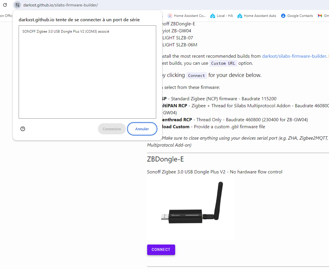 - Mise à jour avec le lien de @ddfdom : Silabs Firmware Flasher | Web based flasher for ZB-GW04 and ZBDongle-E. MultiPAN RCP firmware enables these devices to be used with Silabs Multiprotocol Addon in Home Assistant. Allow Zigbee and Thread to co-exist on the same dongle. Get ahead of the tech an experiment with Matter!