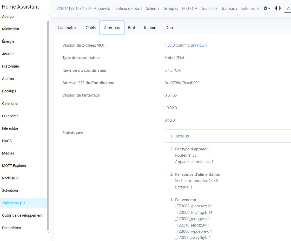 - Modification du type adaptateur de « ezsp » en « ember » dans le fichier /zigbee2mqtt/configuration.yaml