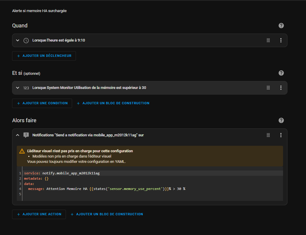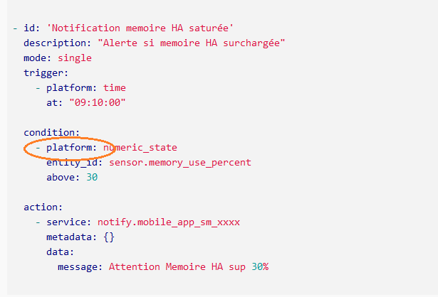 message: Attention Mémoire HA {{states('sensor.memory_use_percent')}}% > 30 %