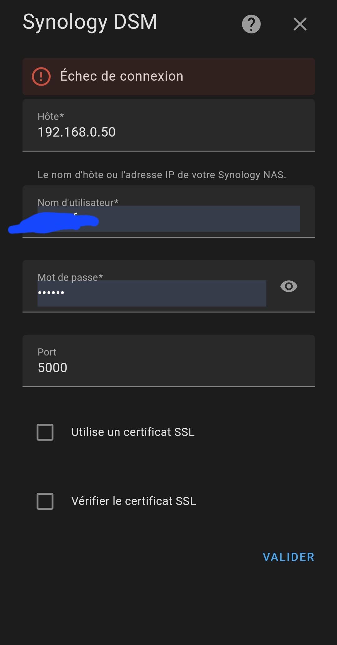 Côté NAS, j’ai bien donné les accès admin comme demandé, depuis HA, je PING bien le NAS à son adresse. Je n’ai pas d’authentification 2 facteurs sur ce compte…