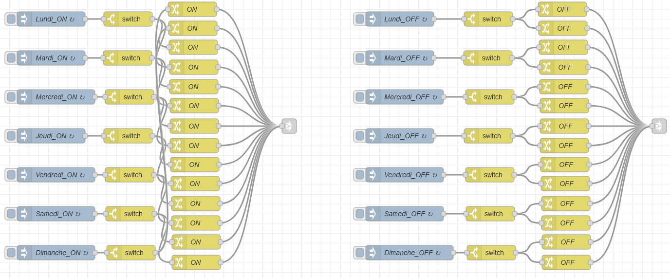 [{"id":"d53f1c07.de4fc8","type":"link out","z":"418c41dd.0bfb48","name":"","links":["acca563f.6da948"],"x":595,"y":260,"wires":[]},{"id":"d96d0acf.16e0d","type":"inject","z":"418c41dd.0bfb48","name":"Lundi_ON","props":[{"p":"payload"}],"repeat":"","crontab":"59 19 * * 1","once":false,"onceDelay":0.1,"topic":"","payload":"on","payloadType":"str","x":106,"y":40,"wires":[["bab243.e1f445c"]]},{"id":"d68a344e.aabcc8","type":"inject","z":"418c41dd.0bfb48","name":"Mardi_ON","props":[{"p":"payload"}],"repeat":"","crontab":"59 19 * * 2","once":false,"onceDelay":0.1,"topic":"","payload":"on","payloadType":"str","x":106,"y":120,"wires":[["28e69362.74b584"]]},{"id":"86c01580.3fbb7","type":"inject","z":"418c41dd.0bfb48","name":"Mercredi_ON","props":[{"p":"payload"}],"repeat":"","crontab":"59 19 * * 3","once":false,"onceDelay":0.1,"topic":"","payload":"on","payloadType":"str","x":116,"y":200,"wires":[["6ff1776a.afd11"]]},{"id":"589897ef.8cff5","type":"inject","z":"418c41dd.0bfb48","name":"Jeudi_ON","props":[{"p":"payload"}],"repeat":"","crontab":"59 19 * * 4","once":false,"onceDelay":0.1,"topic":"","payload":"on","payloadType":"str","x":106,"y":280,"wires":[["5ffe40a8.b20be"]]},{"id":"ed96370.2893fc8","type":"inject","z":"418c41dd.0bfb48","name":"Vendredi_ON","props":[{"p":"payload"}],"repeat":"","crontab":"59 19 * * 5","once":false,"onceDelay":0.1,"topic":"","payload":"on","payloadType":"str","x":116,"y":360,"wires":[["c7559832.e7e62"]]},{"id":"9f704e57.328a28","type":"inject","z":"418c41dd.0bfb48","name":"Samedi_ON","props":[{"p":"payload"}],"repeat":"","crontab":"59 19 * * 6","once":false,"onceDelay":0.1,"topic":"","payload":"on","payloadType":"str","x":116,"y":440,"wires":[["8f518a3d.d25eb8"]]},{"id":"18acc323.4fdf25","type":"inject","z":"418c41dd.0bfb48","name":"Dimanche_ON","props":[{"p":"payload"}],"repeat":"","crontab":"59 19 * * 0","once":false,"onceDelay":0.1,"topic":"","payload":"on","payloadType":"str","x":116,"y":520,"wires":[["6e275598.57890c"]]},{"id":"9d7bcfe2.89e23","type":"change","z":"418c41dd.0bfb48","name":"ON","rules":[{"t":"set","p":"payload","pt":"msg","to":"{\"entity_id\":\"input_boolean.wakeweekday_mon_1\"}","tot":"str"},{"t":"set","p":"query.device_type","pt":"msg","to":"input_boolean","tot":"str"},{"t":"set","p":"query.service","pt":"msg","to":"turn_on","tot":"str"}],"action":"","property":"","from":"","to":"","reg":false,"x":396,"y":20,"wires":[["d53f1c07.de4fc8"]]},{"id":"355c22ef.8e24ae","type":"change","z":"418c41dd.0bfb48","name":"ON","rules":[{"t":"set","p":"payload","pt":"msg","to":"{\"entity_id\":\"input_boolean.wakeweekday_mon_2\"}","tot":"str"},{"t":"set","p":"query.device_type","pt":"msg","to":"input_boolean","tot":"str"},{"t":"set","p":"query.service","pt":"msg","to":"turn_on","tot":"str"}],"action":"","property":"","from":"","to":"","reg":false,"x":397,"y":59,"wires":[["d53f1c07.de4fc8"]]},{"id":"89a55534.5e0b1","type":"change","z":"418c41dd.0bfb48","name":"ON","rules":[{"t":"set","p":"payload","pt":"msg","to":"{\"entity_id\":\"input_boolean.wakeweekday_tue_1\"}","tot":"str"},{"t":"set","p":"query.device_type","pt":"msg","to":"input_boolean","tot":"str"},{"t":"set","p":"query.service","pt":"msg","to":"turn_on","tot":"str"}],"action":"","property":"","from":"","to":"","reg":false,"x":398,"y":98,"wires":[["d53f1c07.de4fc8"]]},{"id":"ed05d9b7.ff101","type":"change","z":"418c41dd.0bfb48","name":"ON","rules":[{"t":"set","p":"payload","pt":"msg","to":"{\"entity_id\":\"input_boolean.wakeweekday_tue_2\"}","tot":"str"},{"t":"set","p":"query.device_type","pt":"msg","to":"input_boolean","tot":"str"},{"t":"set","p":"query.service","pt":"msg","to":"turn_on","tot":"str"}],"action":"","property":"","from":"","to":"","reg":false,"x":399,"y":139,"wires":[["d53f1c07.de4fc8"]]},{"id":"fe930fcd.dda888","type":"change","z":"418c41dd.0bfb48","name":"ON","rules":[{"t":"set","p":"payload","pt":"msg","to":"{\"entity_id\":\"input_boolean.wakeweekday_wed_1\"}","tot":"str"},{"t":"set","p":"query.device_type","pt":"msg","to":"input_boolean","tot":"str"},{"t":"set","p":"query.service","pt":"msg","to":"turn_on","tot":"str"}],"action":"","property":"","from":"","to":"","reg":false,"x":399,"y":179,"wires":[["d53f1c07.de4fc8"]]},{"id":"35c434a5.6806d4","type":"change","z":"418c41dd.0bfb48","name":"ON","rules":[{"t":"set","p":"payload","pt":"msg","to":"{\"entity_id\":\"{\"entity_id\":\"input_boolean.wakeweekday_wed_2\"}\"}","tot":"str"},{"t":"set","p":"query.device_type","pt":"msg","to":"input_boolean","tot":"str"},{"t":"set","p":"query.service","pt":"msg","to":"turn_on","tot":"str"}],"action":"","property":"","from":"","to":"","reg":false,"x":400,"y":218,"wires":[["d53f1c07.de4fc8"]]},{"id":"622320a5.2f7508","type":"change","z":"418c41dd.0bfb48","name":"ON","rules":[{"t":"set","p":"payload","pt":"msg","to":"{\"entity_id\":\"input_boolean.wakeweekday_thu_1\"}","tot":"str"},{"t":"set","p":"query.device_type","pt":"msg","to":"input_boolean","tot":"str"},{"t":"set","p":"query.service","pt":"msg","to":"turn_on","tot":"str"}],"action":"","property":"","from":"","to":"","reg":false,"x":400,"y":260,"wires":[["d53f1c07.de4fc8"]]},{"id":"5cd880eb.713ef8","type":"change","z":"418c41dd.0bfb48","name":"ON","rules":[{"t":"set","p":"payload","pt":"msg","to":"{\"entity_id\":\"input_boolean.wakeweekday_thu_2\"}","tot":"str"},{"t":"set","p":"query.device_type","pt":"msg","to":"input_boolean","tot":"str"},{"t":"set","p":"query.service","pt":"msg","to":"turn_on","tot":"str"}],"action":"","property":"","from":"","to":"","reg":false,"x":400,"y":300,"wires":[["d53f1c07.de4fc8"]]},{"id":"495103bf.06890c","type":"change","z":"418c41dd.0bfb48","name":"ON","rules":[{"t":"set","p":"payload","pt":"msg","to":"{\"entity_id\":\"input_boolean.wakeweekday_fri_1\"}","tot":"str"},{"t":"set","p":"query.device_type","pt":"msg","to":"input_boolean","tot":"str"},{"t":"set","p":"query.service","pt":"msg","to":"turn_on","tot":"str"}],"action":"","property":"","from":"","to":"","reg":false,"x":401,"y":339,"wires":[["d53f1c07.de4fc8"]]},