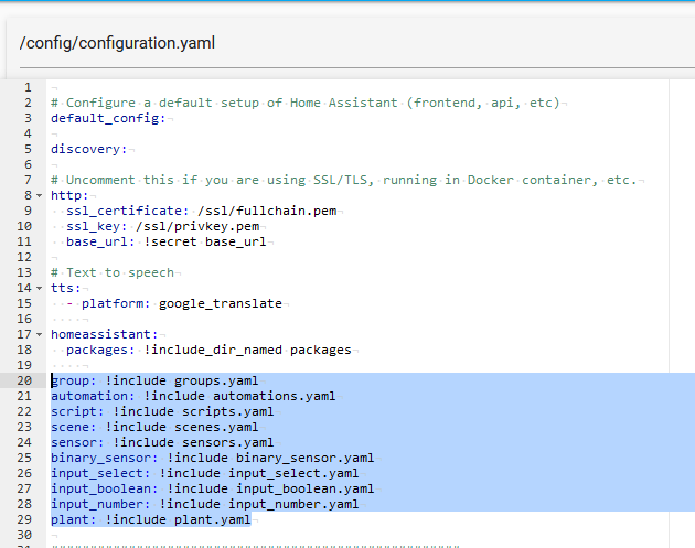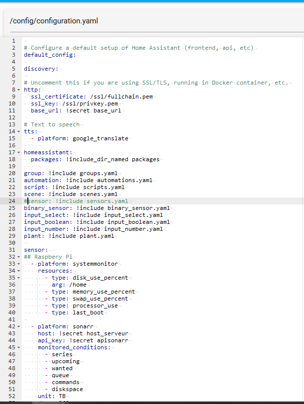 Via cette méthode, vous allez pouvoir séparer votre configuration.yaml et lui ajouter des fichiers annexes (sensors.yaml, plants.yaml, input_booleen.yaml, etc).