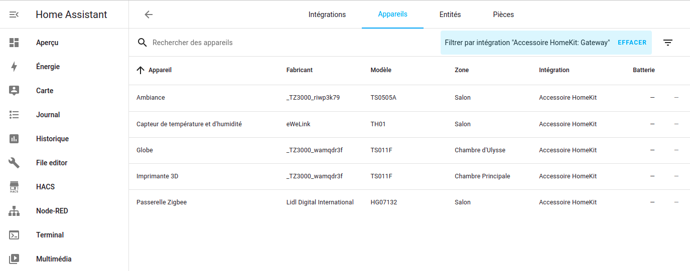 Après avoir configuré l’intégration HomeKit controller, tous les périphériques Zigbee déjà associés à ma passerelle sont également remontés et fonctionnels.