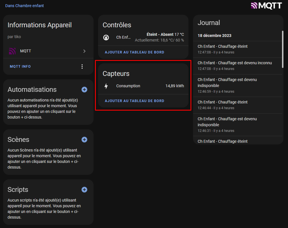 Je voudrais tout d’abord te remercie @marvinroger pour ce plugin, qui simplifie énormément l’intégration de Tiko dans Home Assistant, ca marche super bien et c’est très réactif. Je voudrais savoir si tu pourrai ajouté des capteurs supplémentaire pour chaque radiateur dans les entités MQTT ici :