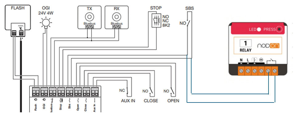 En reliant le contact sec du nodon sur les bornes SBS.