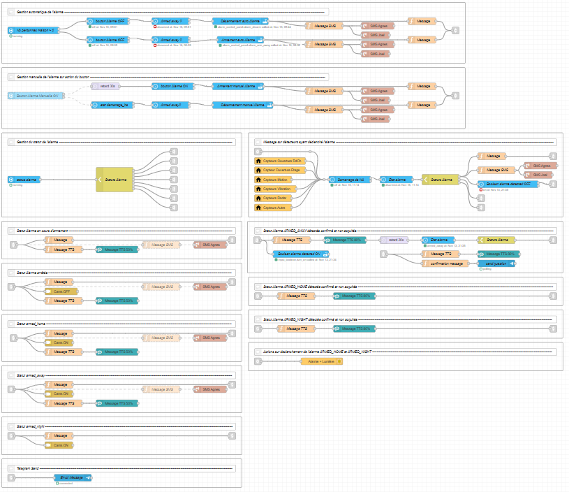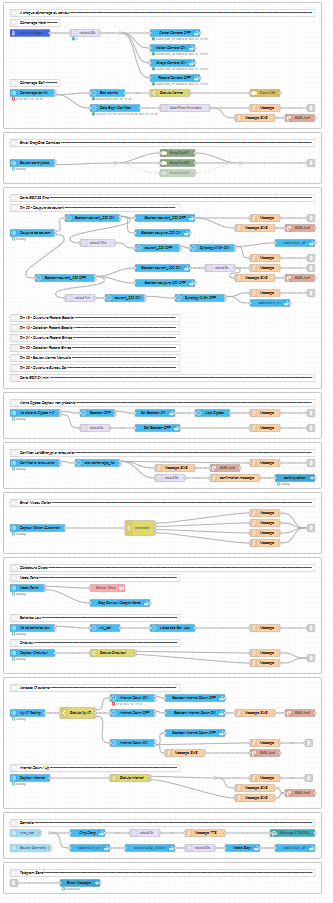 le tout avec tout un système de workflow nodered super bien rangé afin de s’y retrouver, le tout pour gérer les automatisations qui vont de la gestion de l’alarme aux boutons rotatif pour les lampes par exemple, en passant par la gestion automatique de la fontaine du jardin si j’ai oublié de l’éteindre le soir.