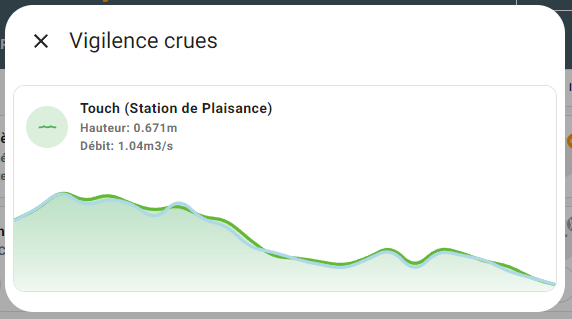 Si tu es intéressé, il est aussi possible de récupérer le niveau Alerte Crue officiel. Je ne l’ai pas intégré au Tuto mais en m’inspirant du travail d’un autre membre du forum, j’ai ajouté cette information à mon dashboard. Celà pourrait être un bon ajout à ta superbe carte « Vigilence crues » (rajouter par exemple un badge Alerte Crue (couleur vert, jaune, etc.) tel que défini par VigiCru.