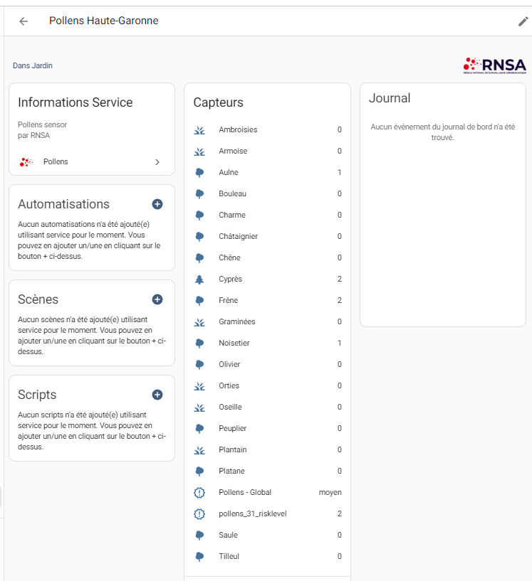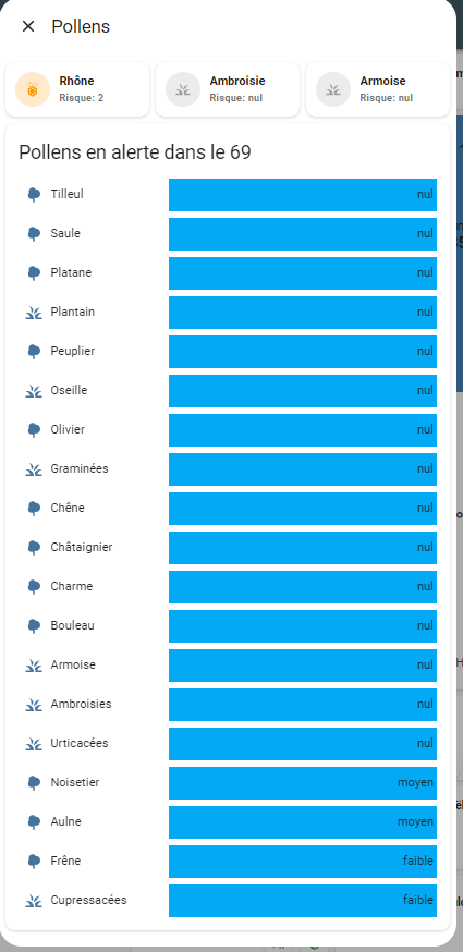 Le clic sur l’icône fleur (couleur fonction du niveau de menace) affiche les pollens (avec une carte automatique) et les info générales et des allergènes intéressant la famille tirés de l’intégration pollens: