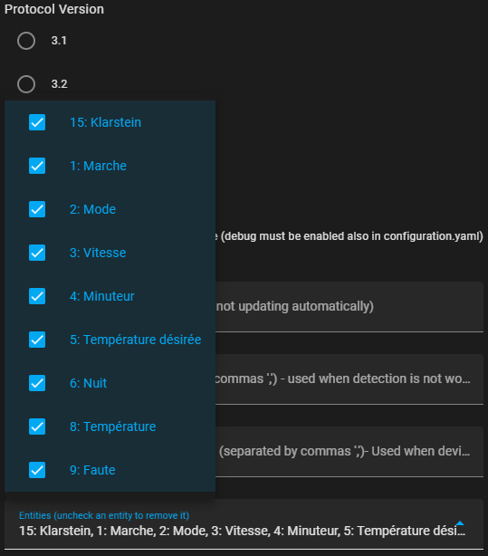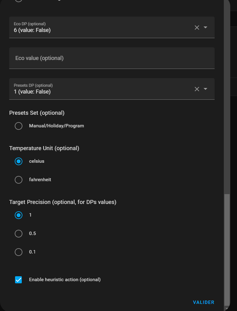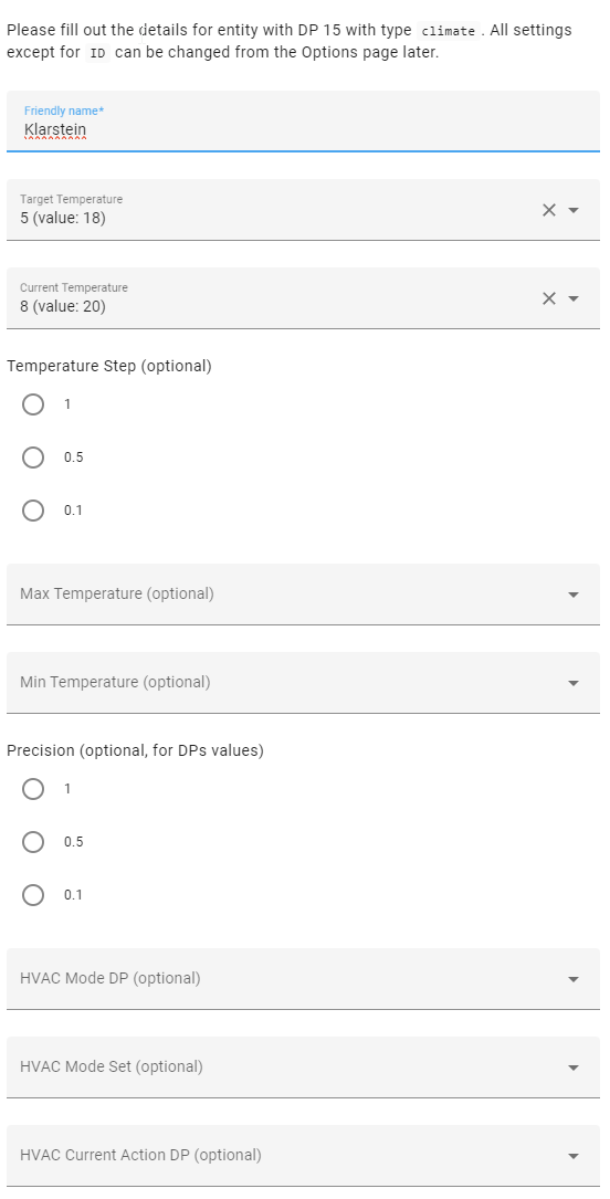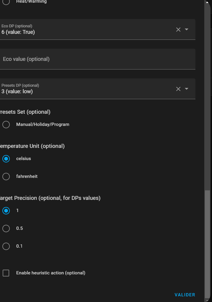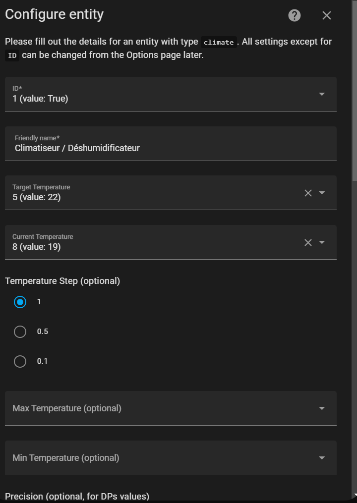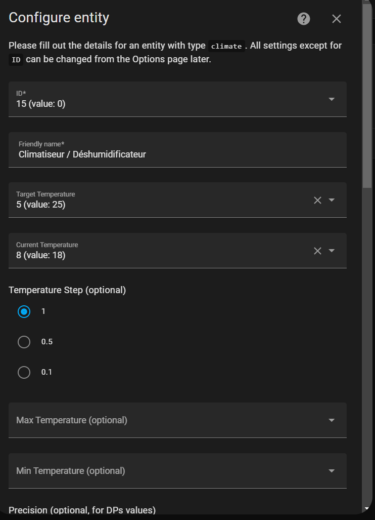 Le premier DP est important je pense, tu as mis 1 qui correspond à Marche chez moi, tu devrais mettre 15 car il s’agit du DP principal. Je parle bien de l’ID que tu mets AVANT le Friendly Name c’est celui qui s’associe bien au « climate ».