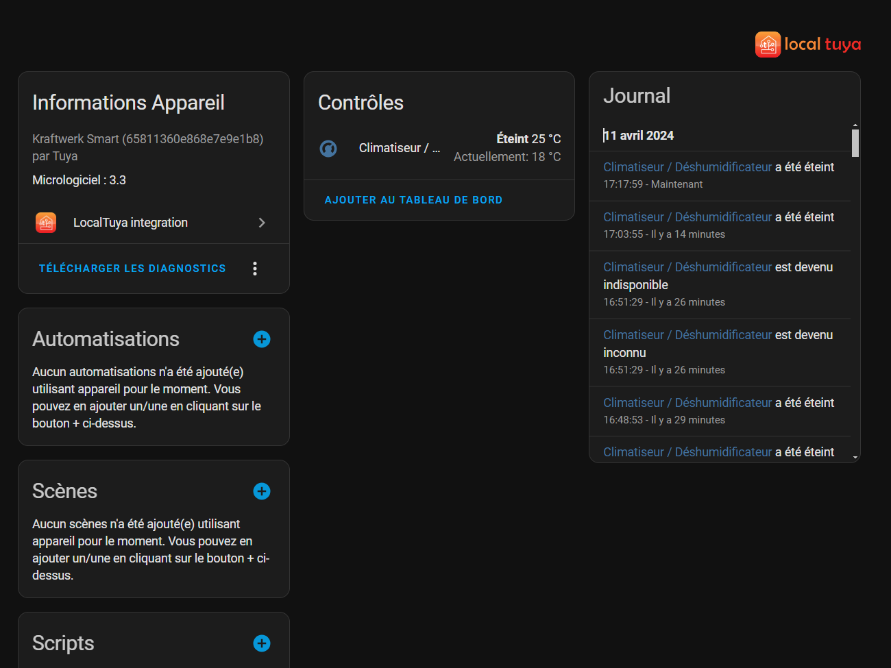 Il faut un compte développeur (gratuit)à Tuya, associer l’appareil au compte et on retrouve le local key. Il y a pas mal de tuto sur la toile et même ici je pense