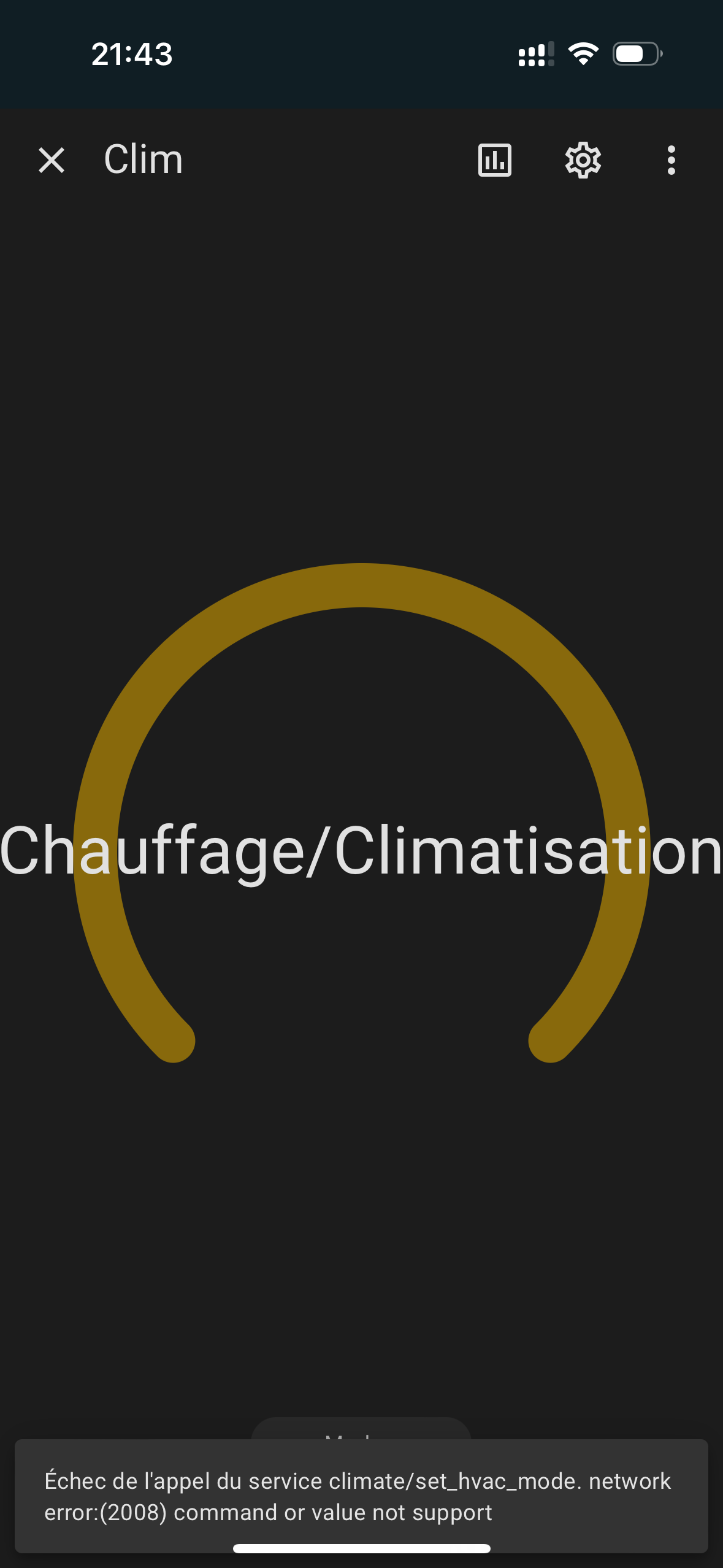 La clim remonte dans HA et créé bien une entité A/C mais je ne parviens pas à la controller : voir code erreur dans le screenshot.