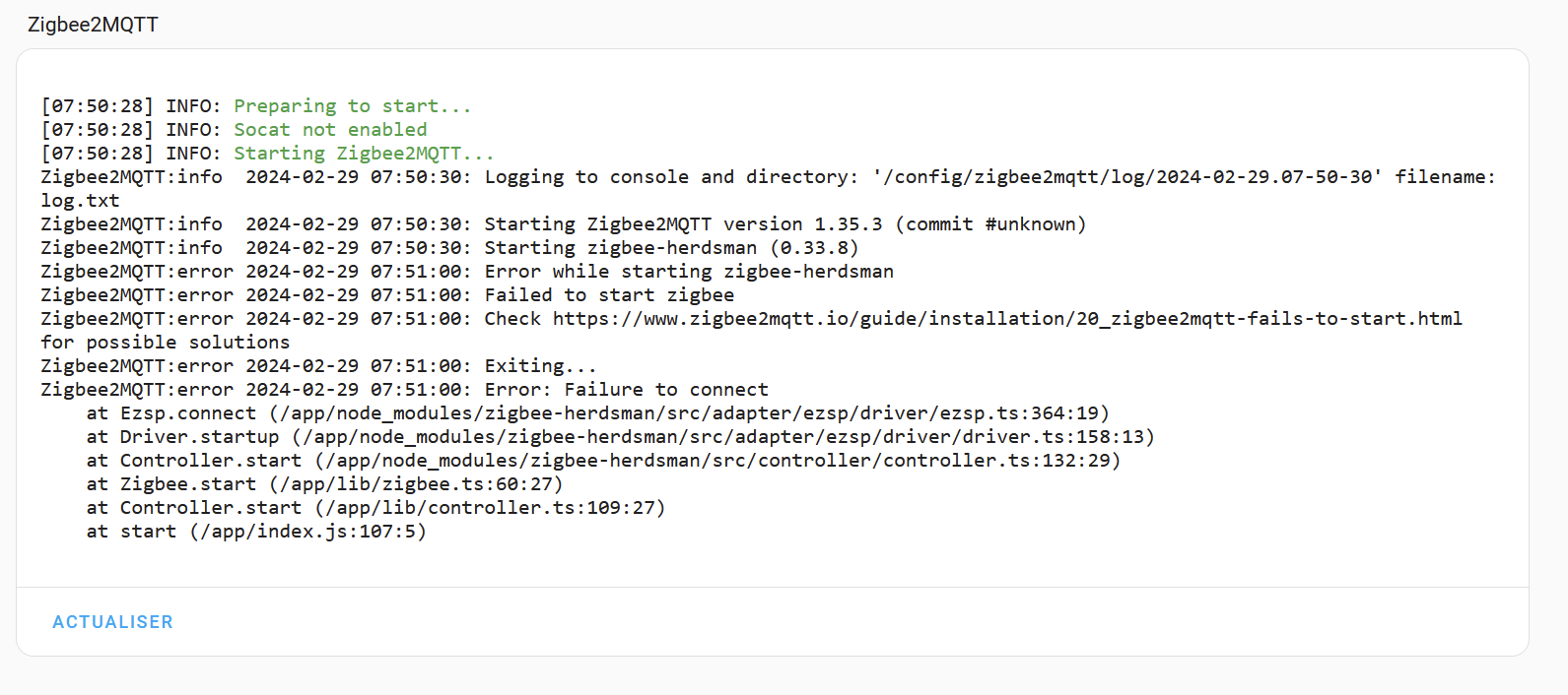 Faut bien désactiver ( ignorer ) ZHA ( Zigbee Home Automation ), sinon Z2M ce lancera pas.
