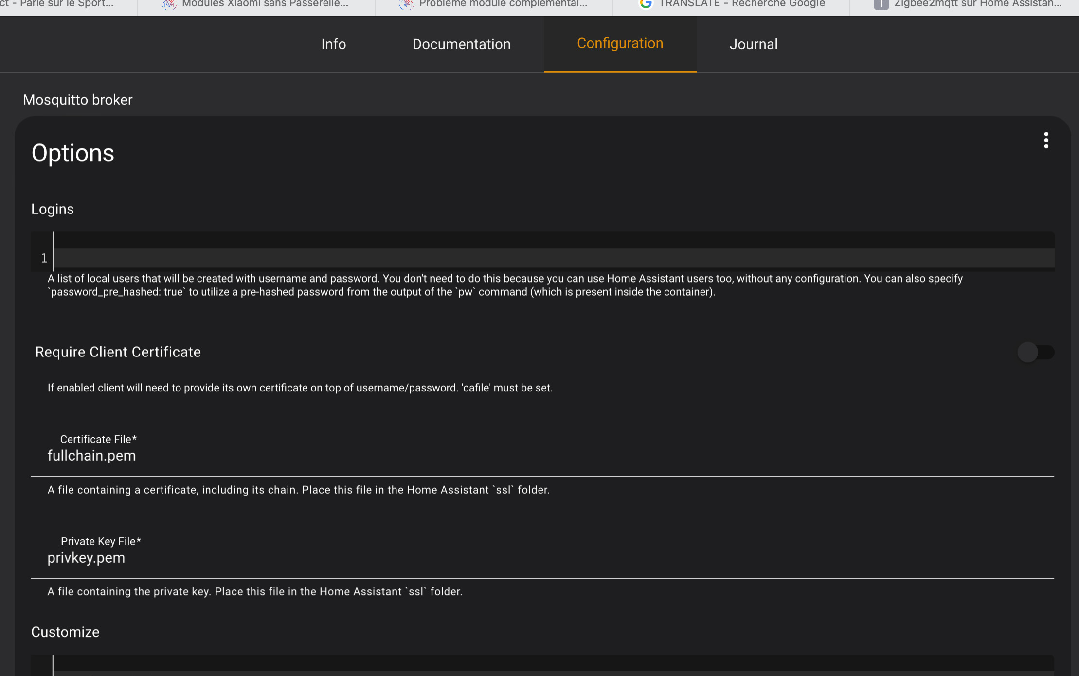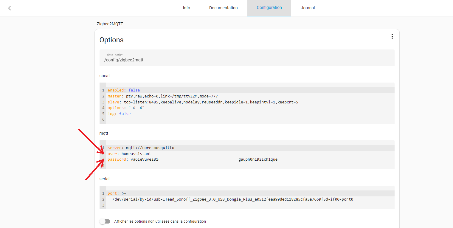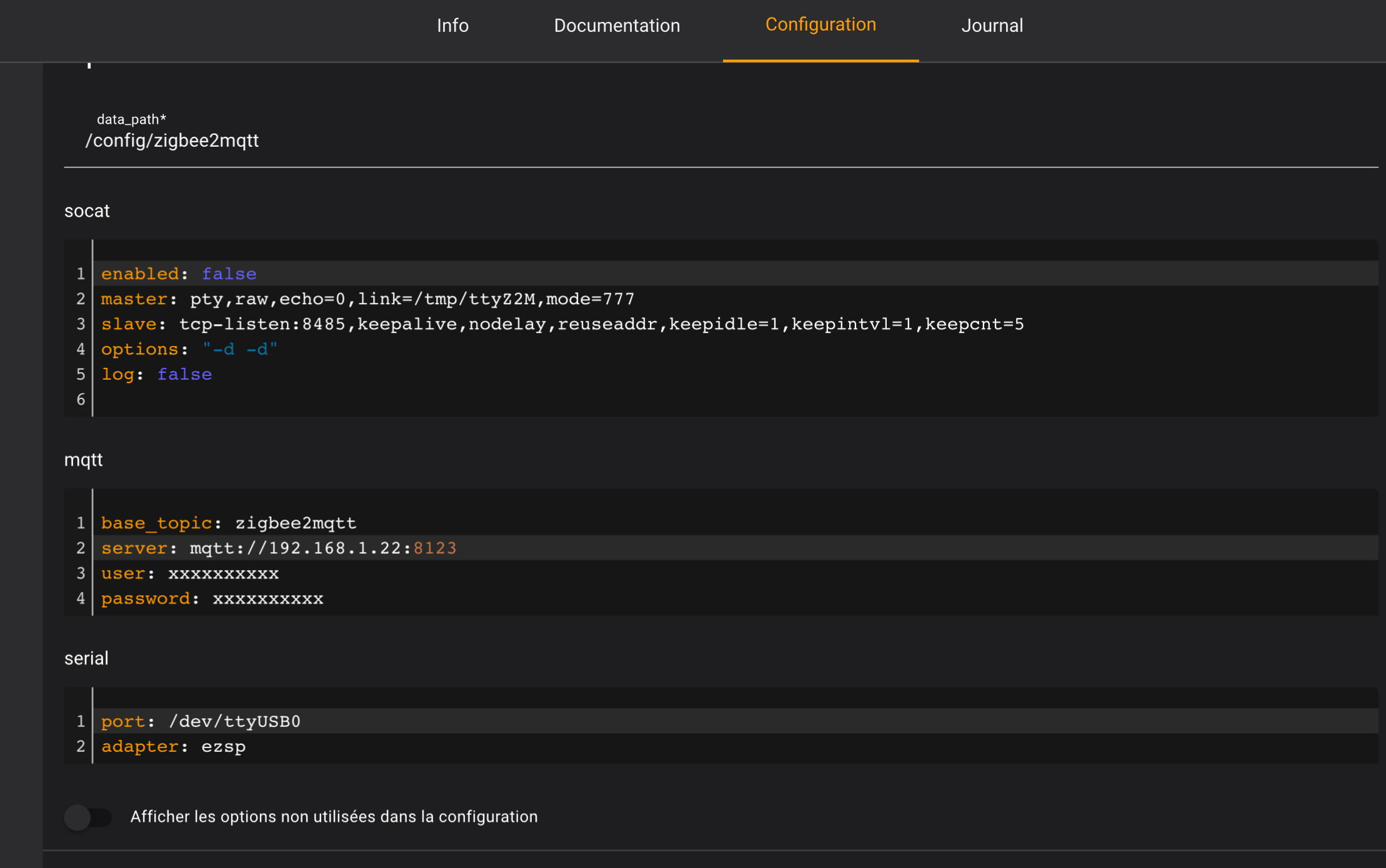 Ensuite, il faudra que tu vérifies ques les informations de Login de MQTT correspondent bien à ce que tu as dans la configuration de zigbee2mqtt :