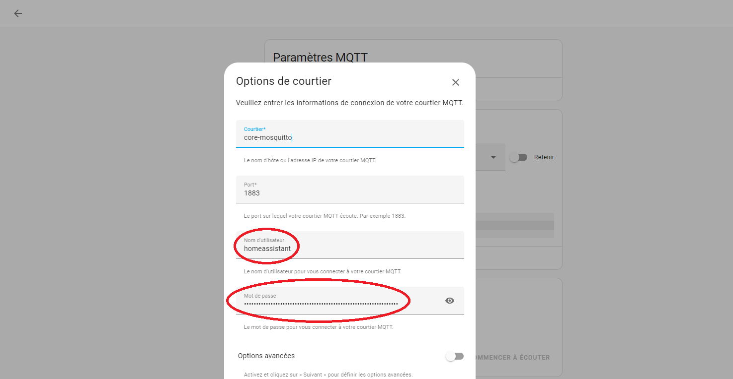 Si ce n’est pas le cas, tu copies les informations de MQTT (« Nom d’utilisateur » → « user : » et « Mot de passe » → « password : ») à la place de ce qu’il y a dans zigbee2mqtt et ensuite tu fermes la fenêtre « Options de courtier » avec la croix (X) en haut à droite :